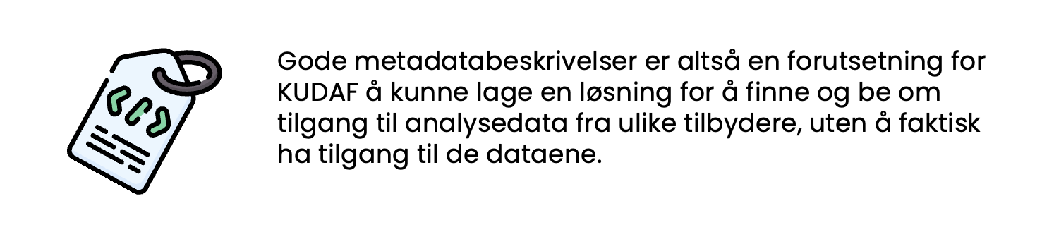 Gode metadatabeskrivelser er en forutsetning for KUDAF å kunne lage en løsning for å finne og be om tilgang til analysedata fra ulike tilbydere, uten å faktisk ha tilgang til de dataene.